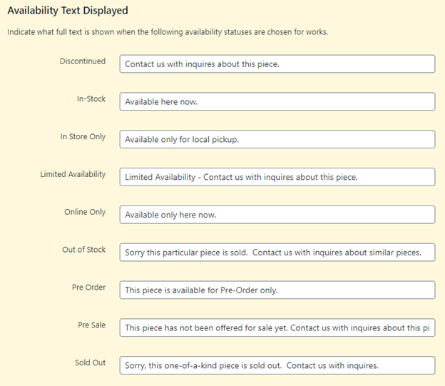 Setting the “Availability Text” Values will make more sense if the “Offers” concept on art works is understood first. I recommend skipping this section and coming back to it when you’re familiar with defining art works.