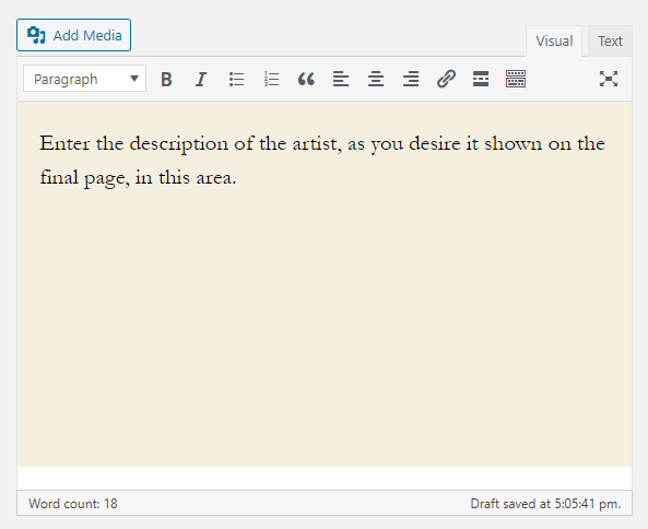 The Artist’s Shortcode allows displaying Artists together on any other type of webpage managed in WordPress, Posts, Pages or custom post types enabled by other plugins. The syntax for it is [display-artists].
