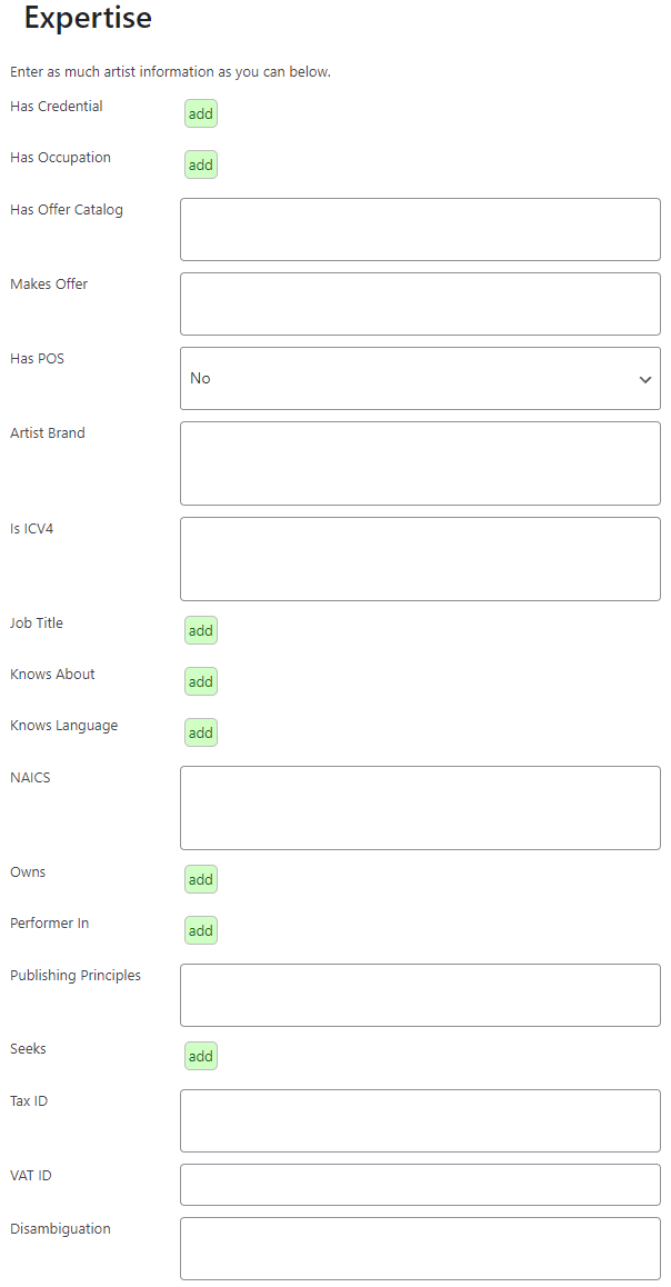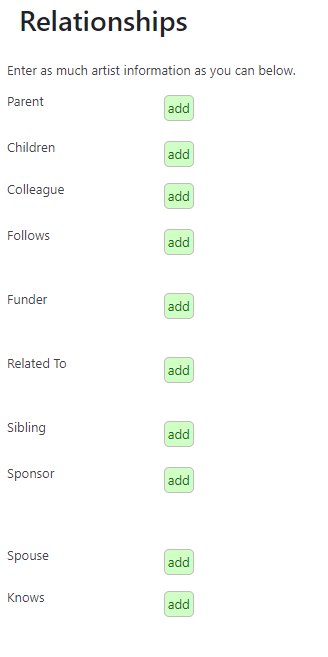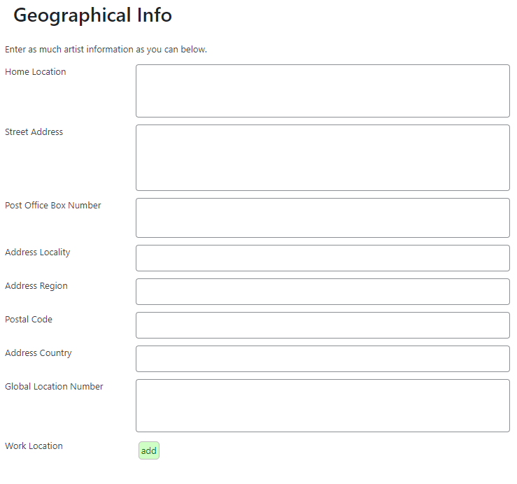 The fields that are available to define Organizations, Artists and ArtWorks are derived from the above Schema.org formal definitions.