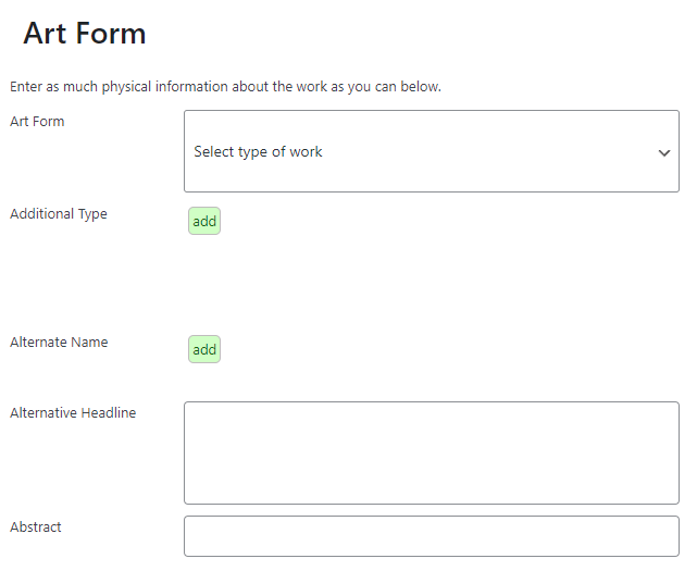 Keywords: The Keywords that are entered into the Context section appear in the Structured Data output of the Art Work webpage. These Keywords, or more specifically “key terms”, should be separated by commas. These Keywords do not impact the page’s Metadata Keywords, or OG tags, but instead are exclusively inserted into the Structured Data maintained by Art Gallery Plugin.