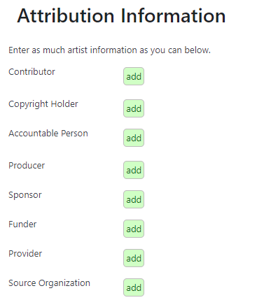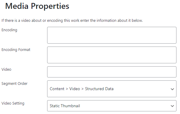 This area of the Art Work Detail section allows recording of the technical properties around media containing or associated with the Creative Work. For example if there’s a video of the Creative Work being experienced or being created, this is where that video can be linked to properly. That one video record of the work can be featured on the page using the settings in the Media Properties area.