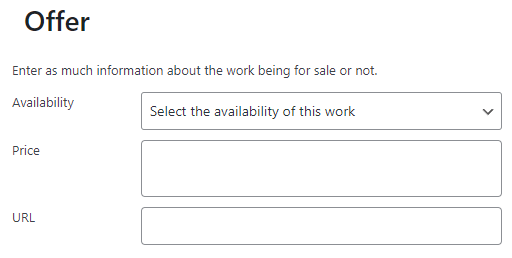 Availability: If the Availability is not selected then none of the fields and values part of the Offer section will be shown. Keep the Availability drop-down un-set in order to suppress the appearance of it and other Offer fields. Values chosen here may not be what’s displayed on the front-end to website visitors. Instead, what’s displayed are the values that are maintained in the Art Gallery Plugin’s Settings. See that section earlier in this document for more information on how that works.
