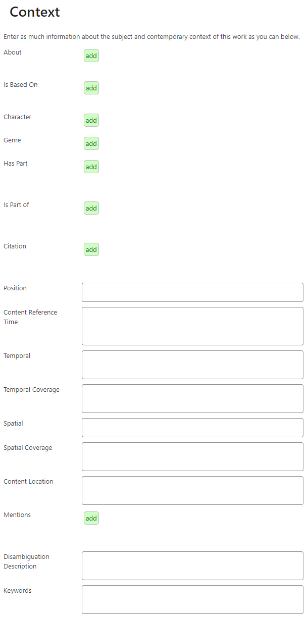 The relationship of this work to derivative works, and what subject matter the work references can be indicated here. This is an important set of fields to fill in. It creates horizontal opportunities for the Creative Works to be shown in The genre and audience can be named here as well. If the Associated Article field is populated, it will be shown as text, not as a link.