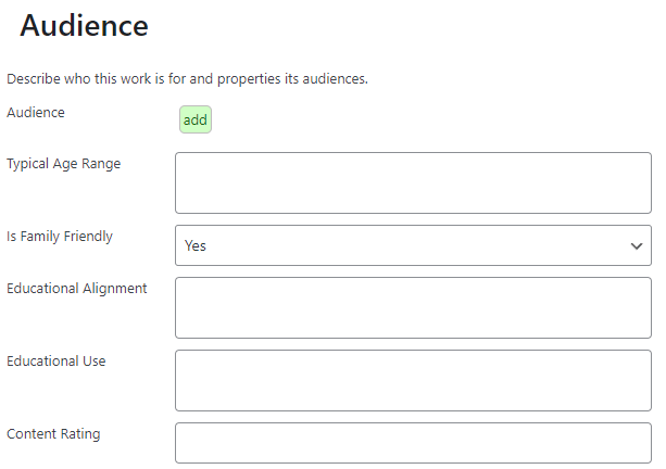 Is Family Friendly: This is a yes or no field that allows indicating whether the Creative Work contains content appropriate to be experienced together by families. Nobody wants to be in the room with your family when there’s a sex scene. That’s so awkward and embarrassing, Use this field to help protect kids from inappropriate content and family moments from cringe.