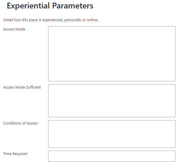 These parameters cover the sensory and security issues around access & experiencing work. The Conditions of Access is used to express limits or conditions required to experience the work. For example, to see an installation indoors attendees may need to sign a sign a log book or walk through a metal detector.
