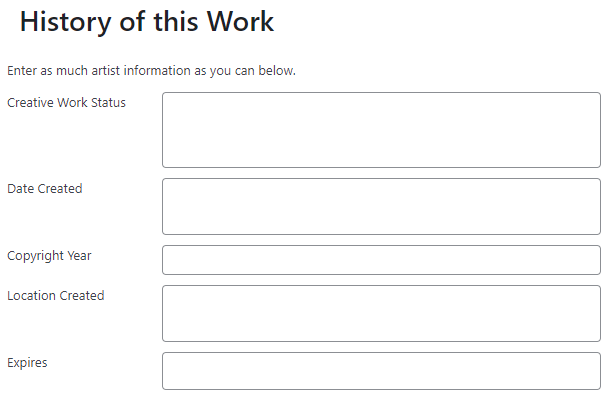 All fields in Art Gallery Plugin could be argued as recording the history of a work. This section more accurately represents the past and present status of the work in time.