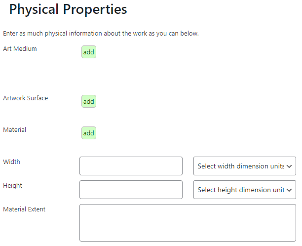 Here the dimensions of the art work and the physical makeup of the work can be described. For certain works this isn’t appropriate, for example video or legislation. These data entry fields apply to visual Artwork mostly, things like paintings or sculptures.