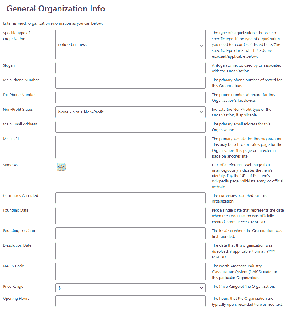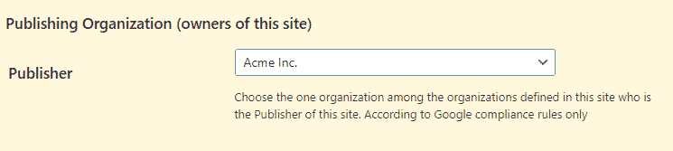 An Organization, which must be pre-defined to be chosen here, will need to be indicated as the Organization this site belongs to aka “is being published by”. According to Google rules, for structured data to be compliant, Publishers cannot be People or Persons. A Publisher of a website must be an Organization. This may not match the real world, but to produce compliant pages that qualify for Rich Results, this parameter must be set to a defined Organization.